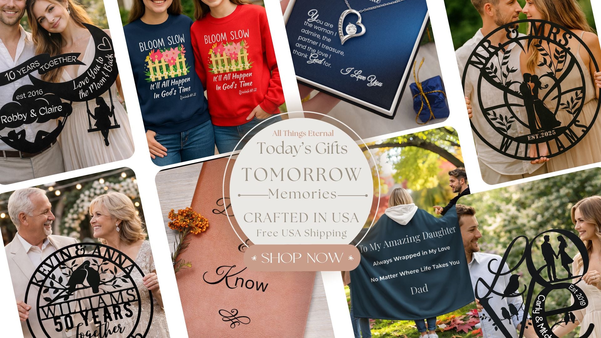 Celebrate your love story with All Things Eternal! Crafted with care, our personalized metal art, mugs, Necklaces, and more make the perfect gifts for anniversaries, weddings, and life’s most cherished moments. Add names, dates, and heartfelt messages to create timeless pieces that make every occasion truly unforgettable.
