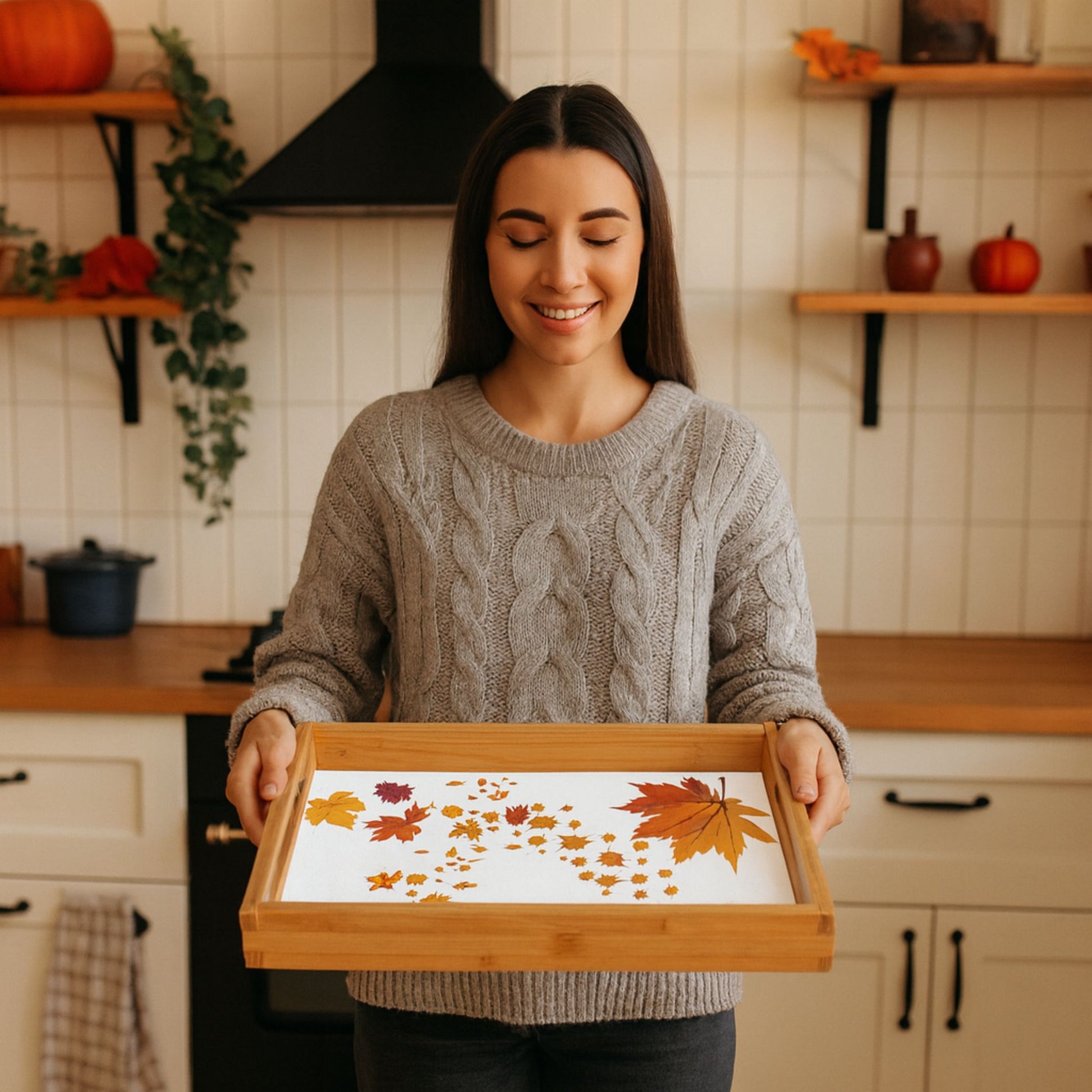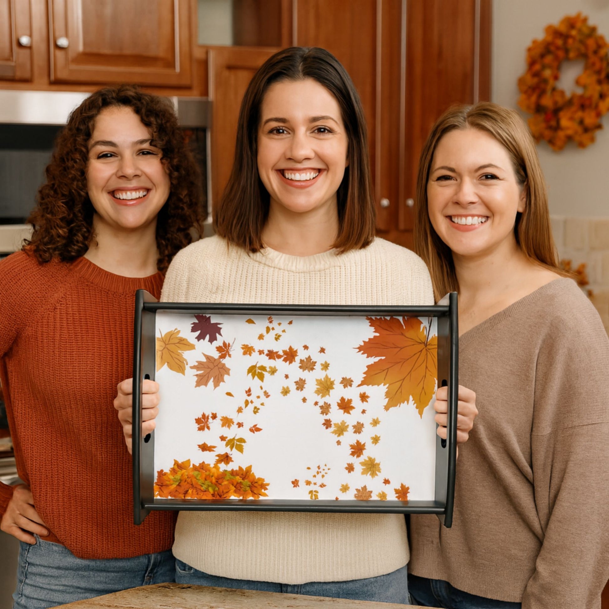 Autumn-Themed Tray perfect for Fall decor and holiday gatherings. Makes a great home gift. This large serving tray is perfect to hold keepsakes or special items. Ideal for adults looking to add a touch of seasonal charm to their home.