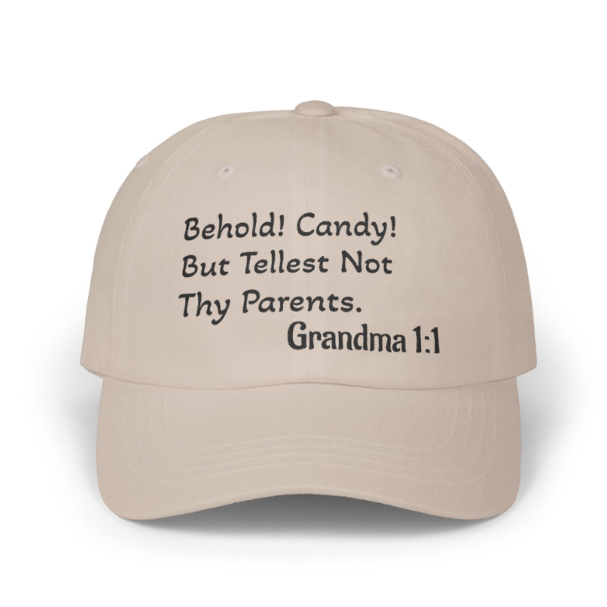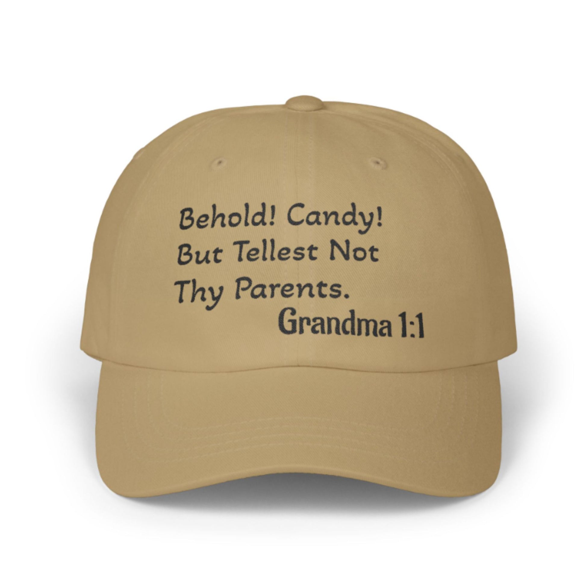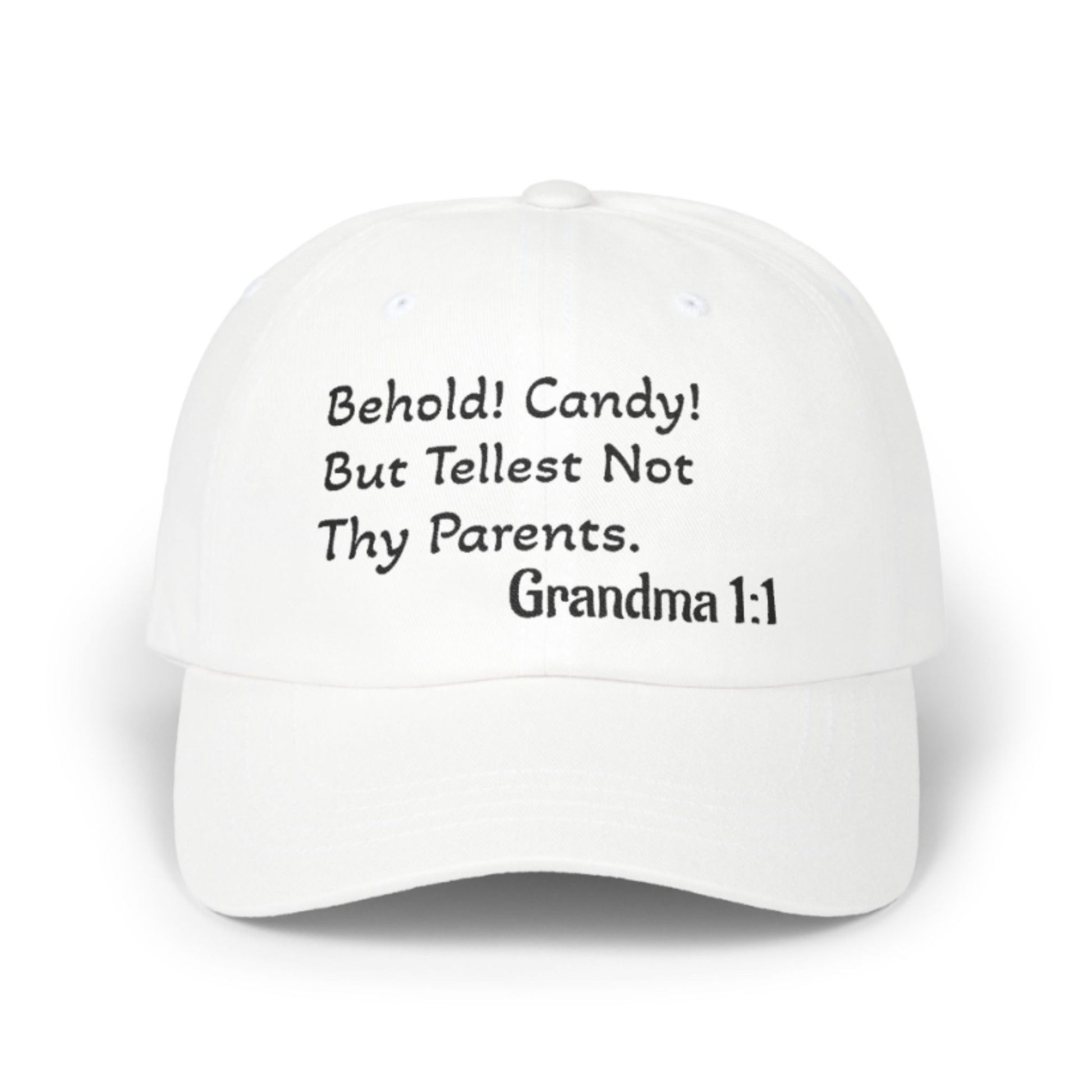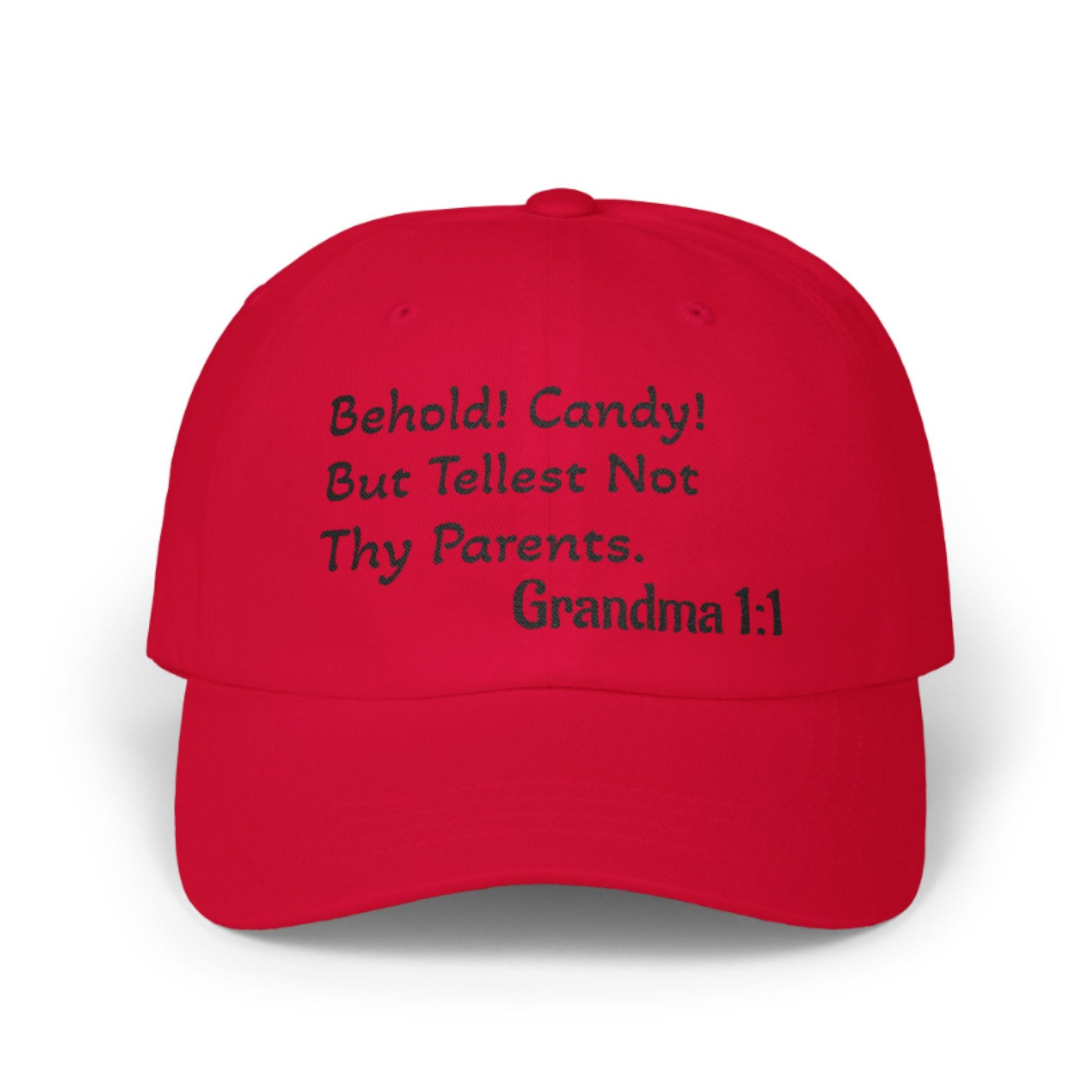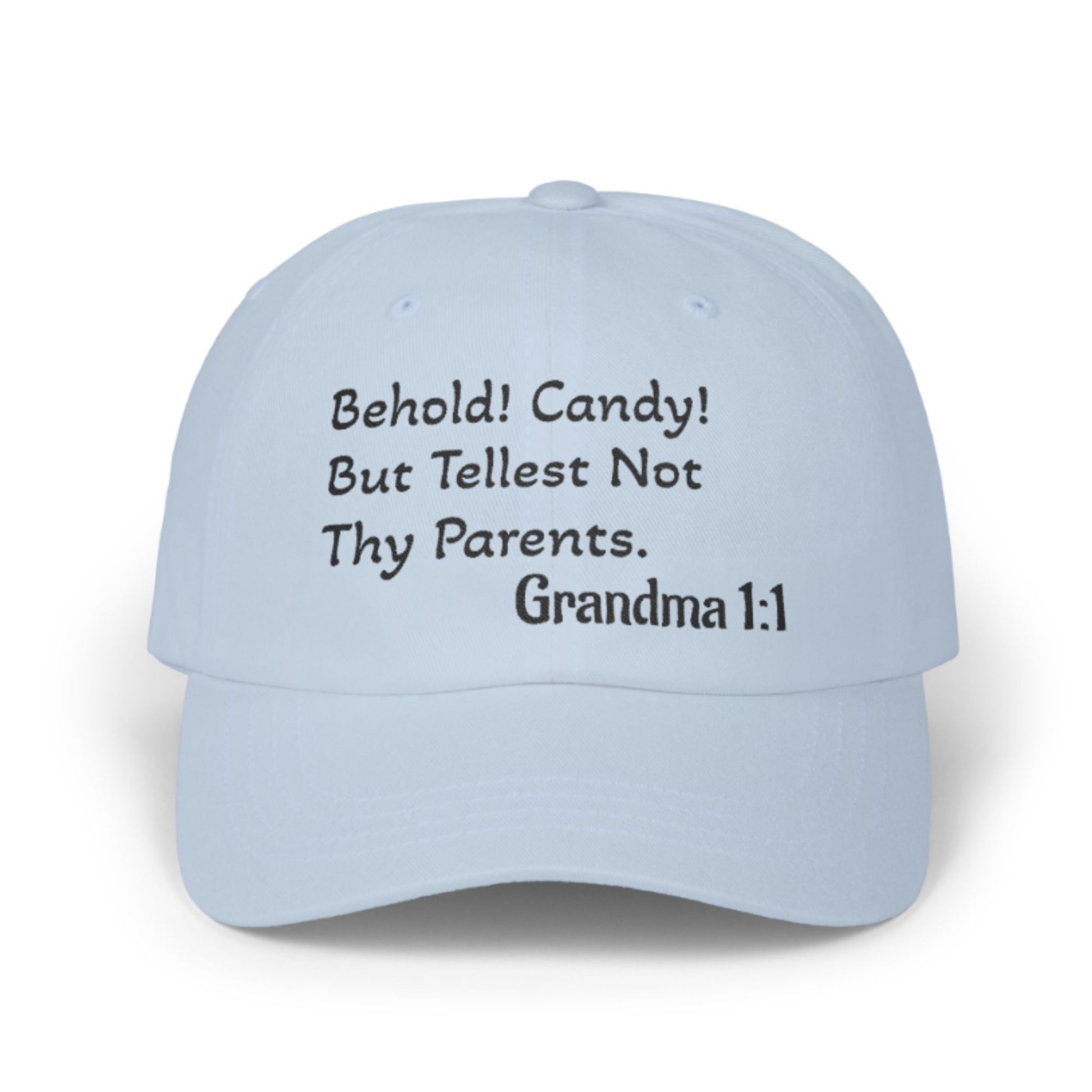 Celebrate the sweet (and slightly sneaky) side of grandma life with this hilarious embroidered baseball cap! Featuring the faux scripture quote: “Behold! Candy! But Tellest Not Thy Parents. – Grandma 1:1”. This playful design blends biblical-style language with the universal truth that grandmas love to spoil their grandkids.