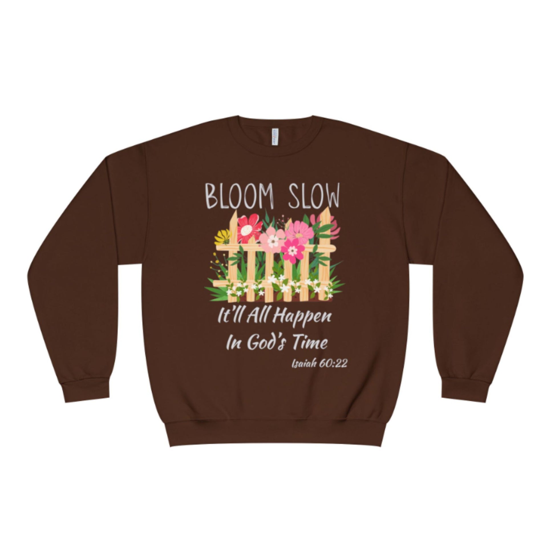 The Bloom Slow Crewneck Sweatshirt is a cozy and inspirational piece of clothing perfect for nature lovers. This botanical sweatshirt exudes a sense of spring and faith-based vibes, making it a great addition to your wardrobe. Whether you're looking for a stylish sweatshirt or a meaningful gift, this sweatshirt is the perfect choice. Ideal for those who appreciate nature and seek inspiration in their daily lives.