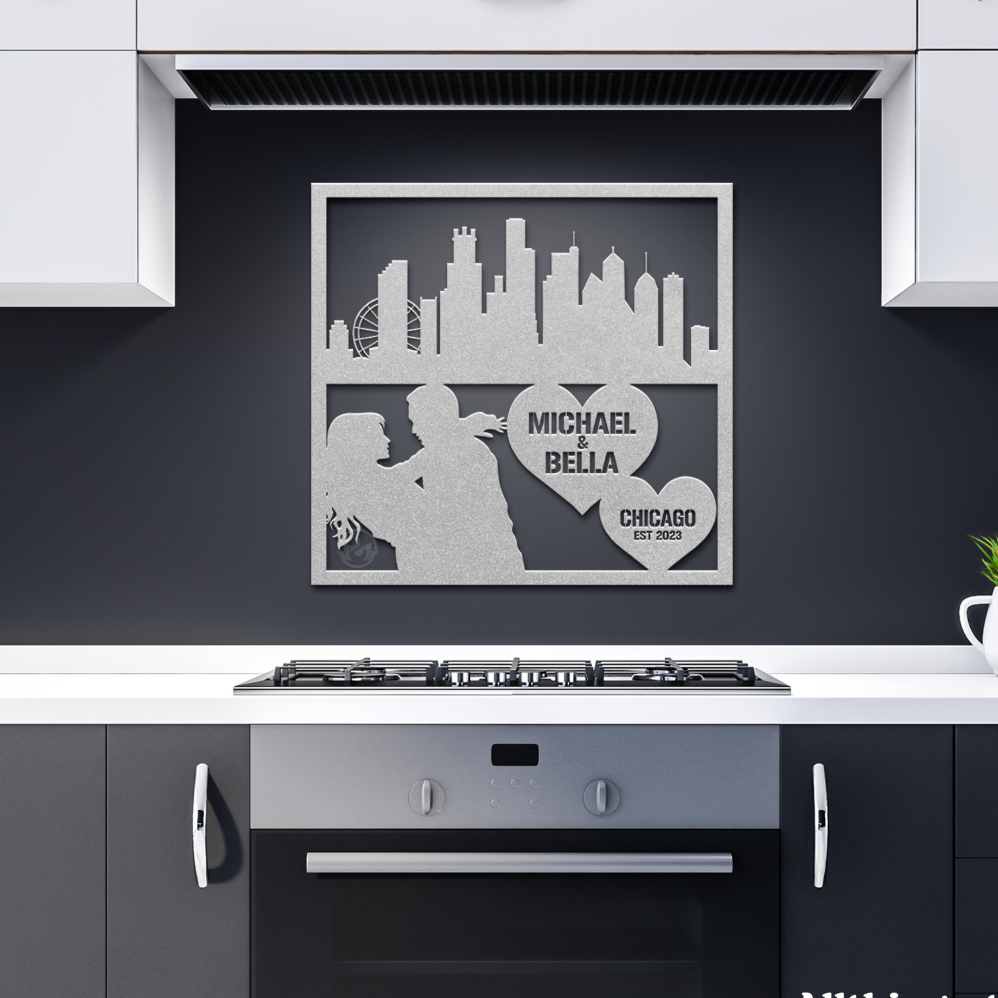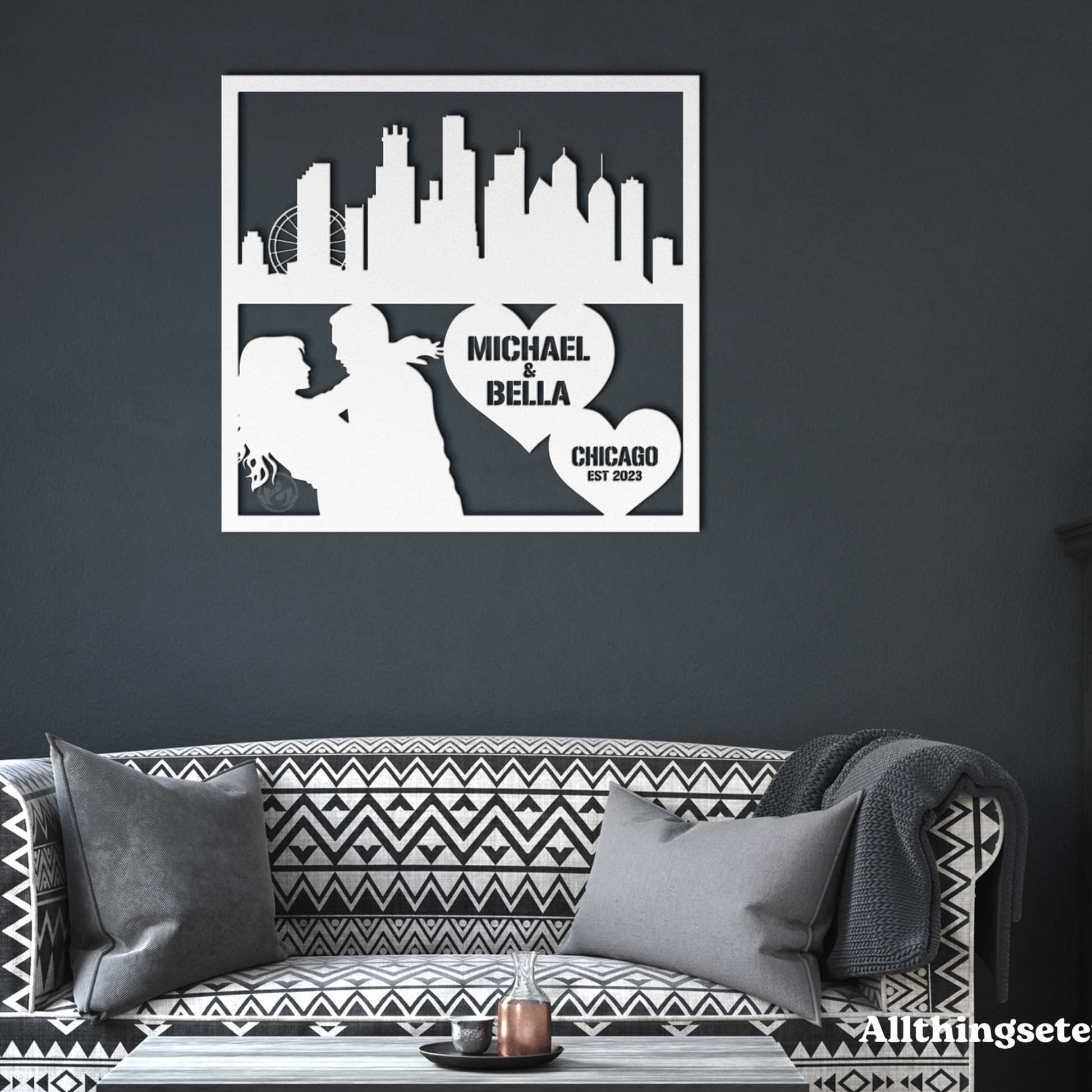 Personalized Chicago Cityscape Couple Metal Wall Hanging Sign-Romantic Gift for Couple