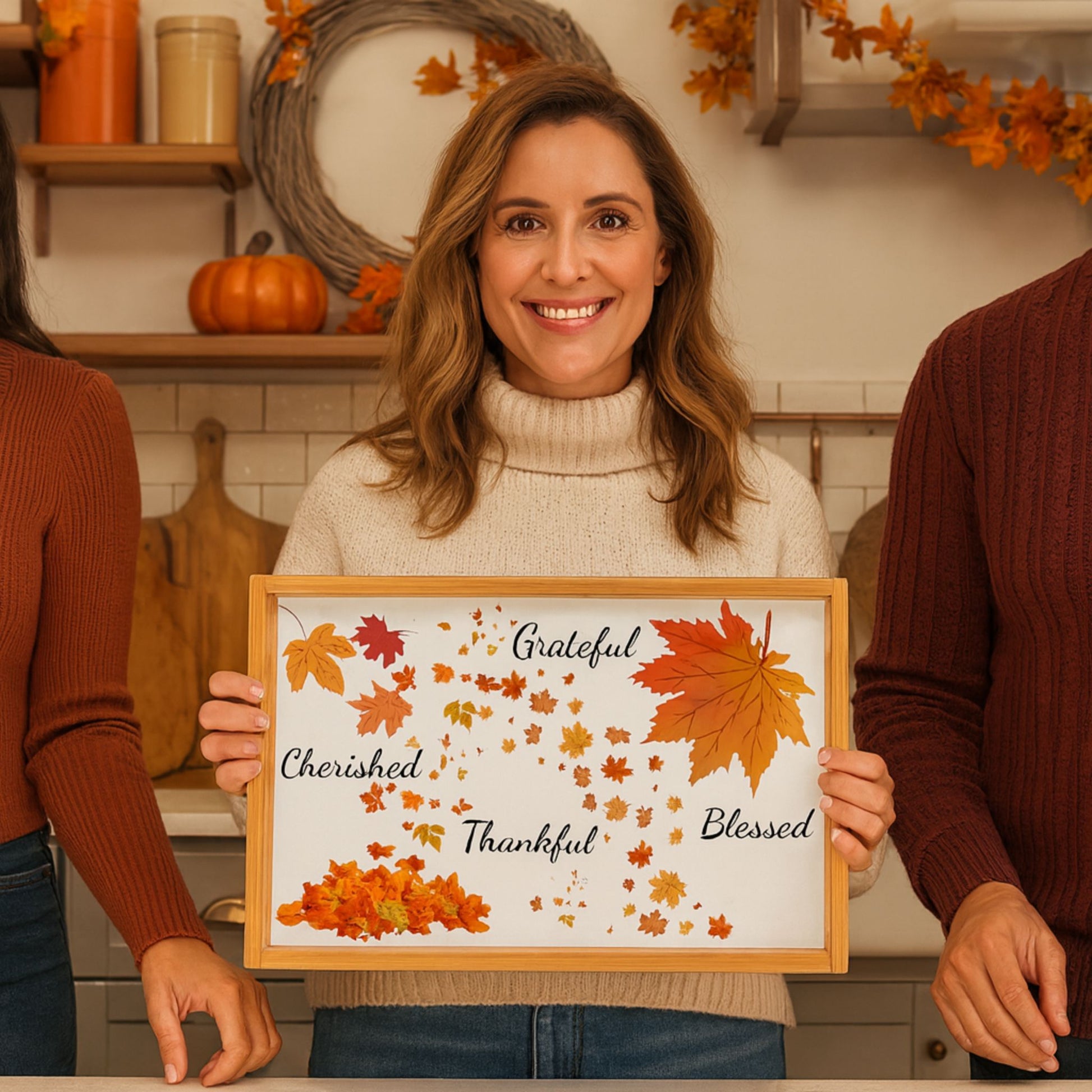 Autumn-themed large serving tray designed with 'Grateful, Thankful, Blessed' message, perfect for Thanksgiving, Fall decor, and holiday gatherings. Ideal for holding keepsakes and special items, adds a warm and festive vibe to your home. Suitable for adults and those looking to add a touch of autumn to their home decor.
