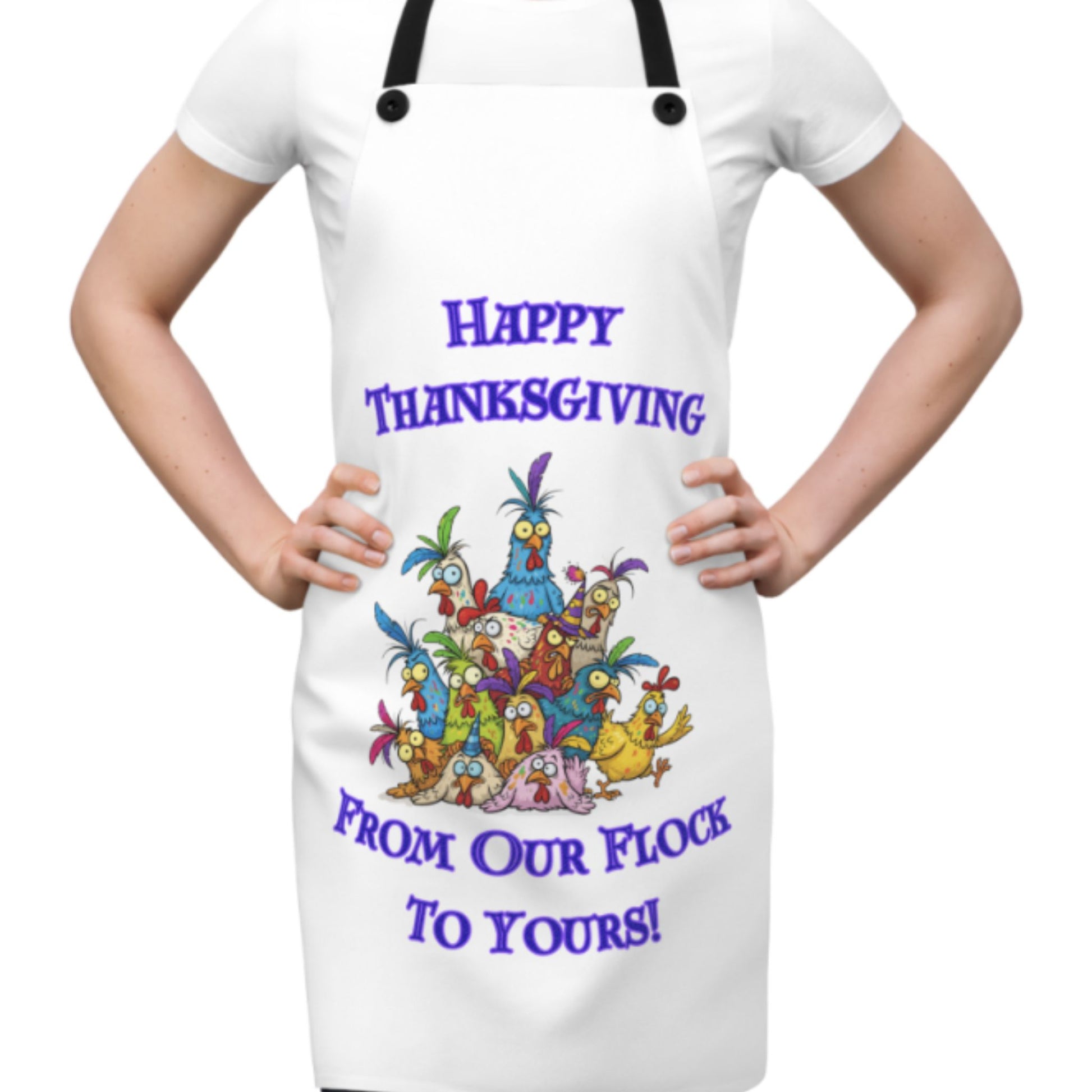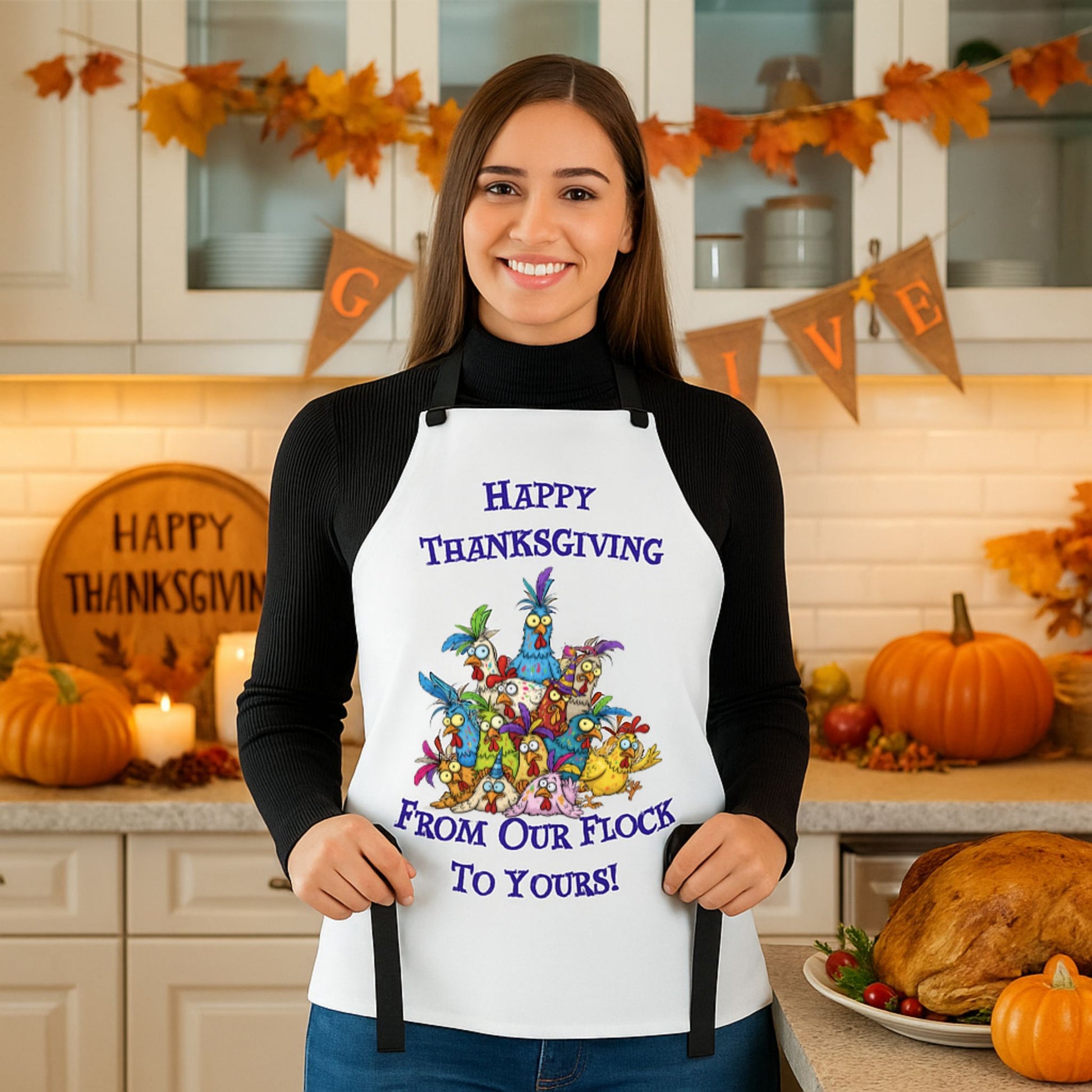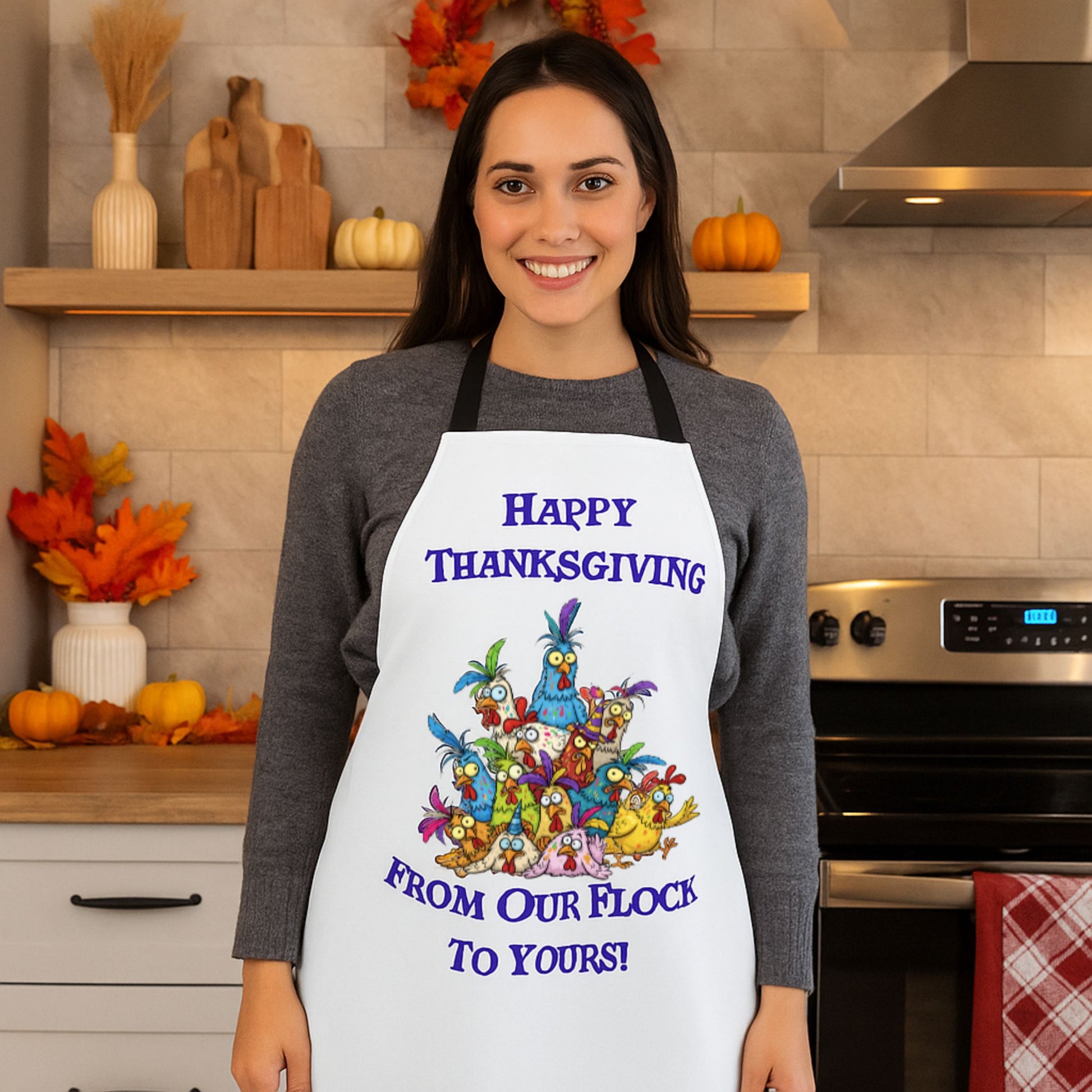 Bring laughter and warmth to your kitchen with our “Happy Thanksgiving From Our Flock to Yours!” apron. Perfect for cooking, baking, and entertaining during the fall season, this funny Thanksgiving apron adds charm and joy to every meal.