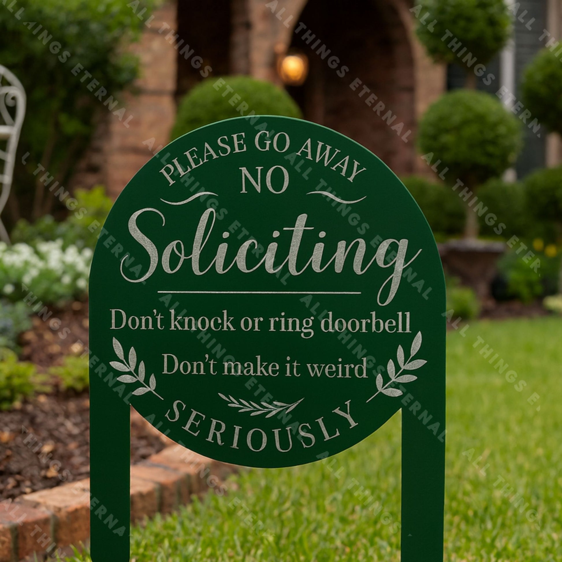 Keep your property private with this sleek “No Soliciting” yard sign. Made of durable, weather-resistant metal, perfect for driveways, gardens, and outdoor spaces.
