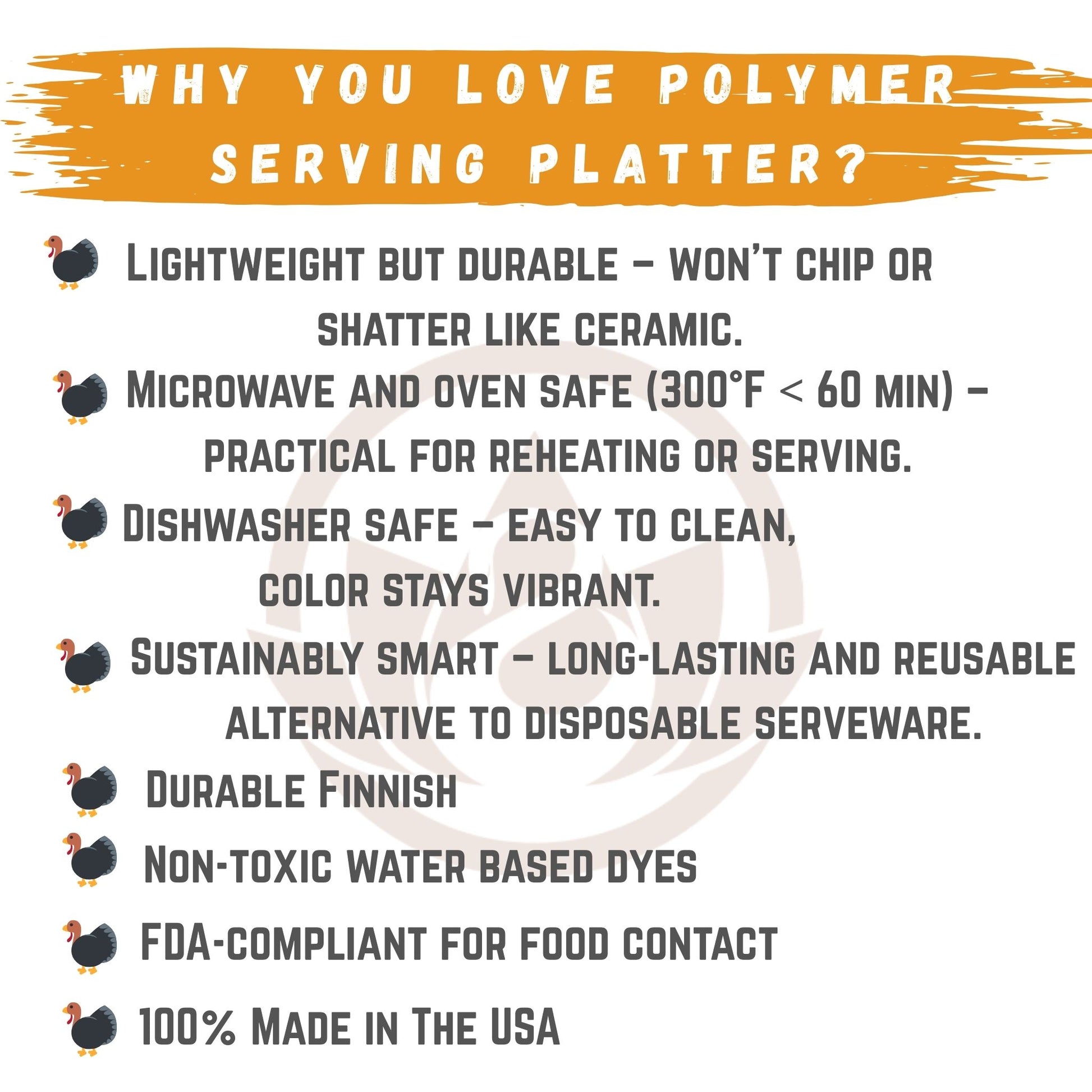Serve with confidence from oven to table (safe up to 300°F) — ideal for turkey, casseroles, snacks, or appetizers. Crafted in the USA with zero BPA, melamine, or formaldehyde, this platter is a safe, non-toxic, and sustainable choice for your kitchen.
