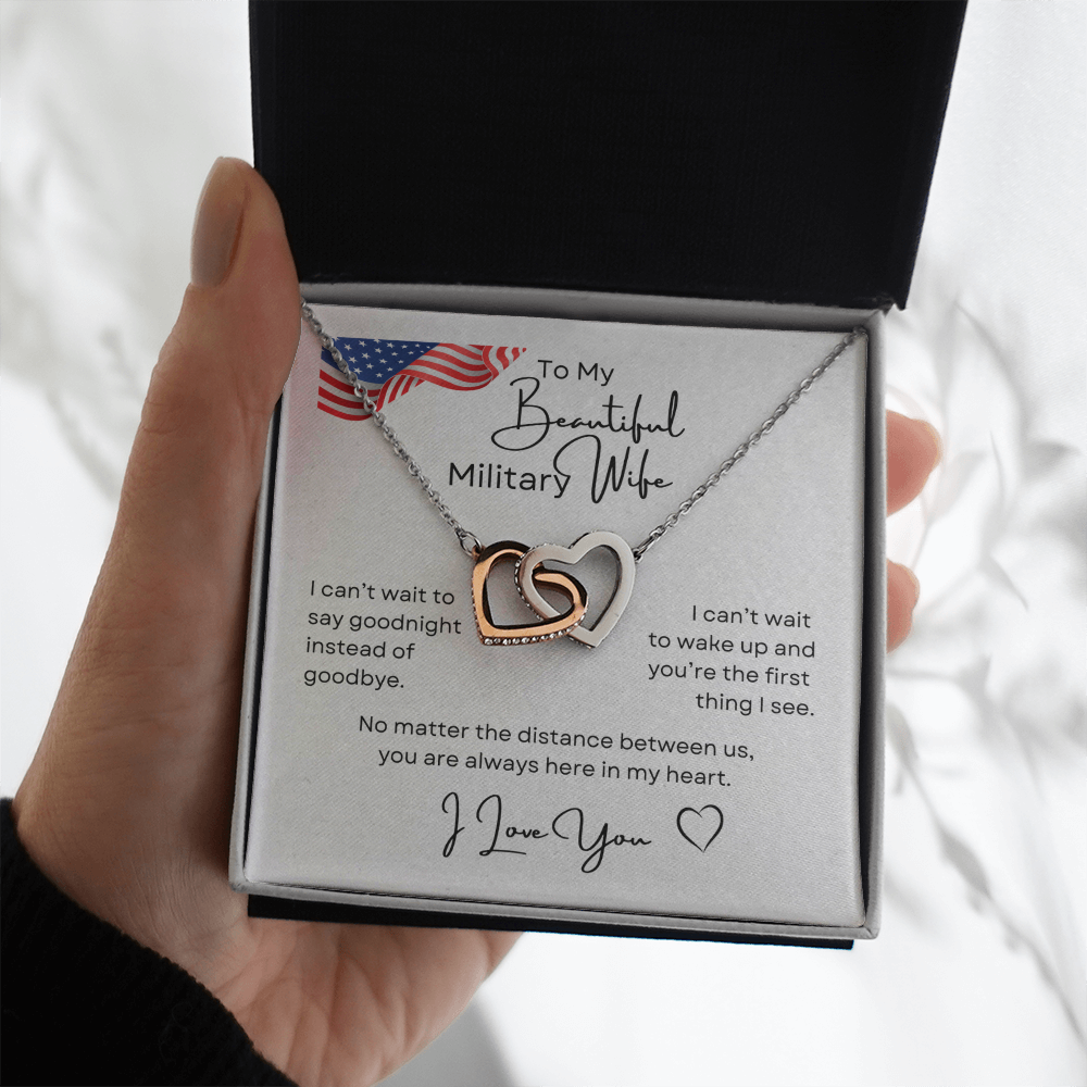 Introducing the Interlocking Hearts Necklace and Message Card – a heartfelt gift that beautifully symbolizes the everlasting connection between you and your military