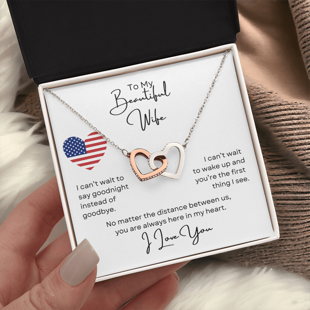 Introducing the Interlocking Hearts Necklace and Message Card – a meaningful gift that symbolizes the eternal connection between you and your military wife.